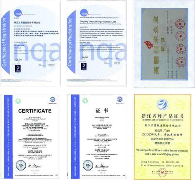 公司已获得TUV公司质量体系:IATF 16949 ISO 9001,环境管理体系:ISO 14001,职业健康安全管理体系:ISO 45001,测量管理体系:ISO 10012《测量管理体系-测量过程和测量设备的要求》标准的要求,被评定为省级技术研发中心,浙江省高新技术企业,并拥有自营进出口权。